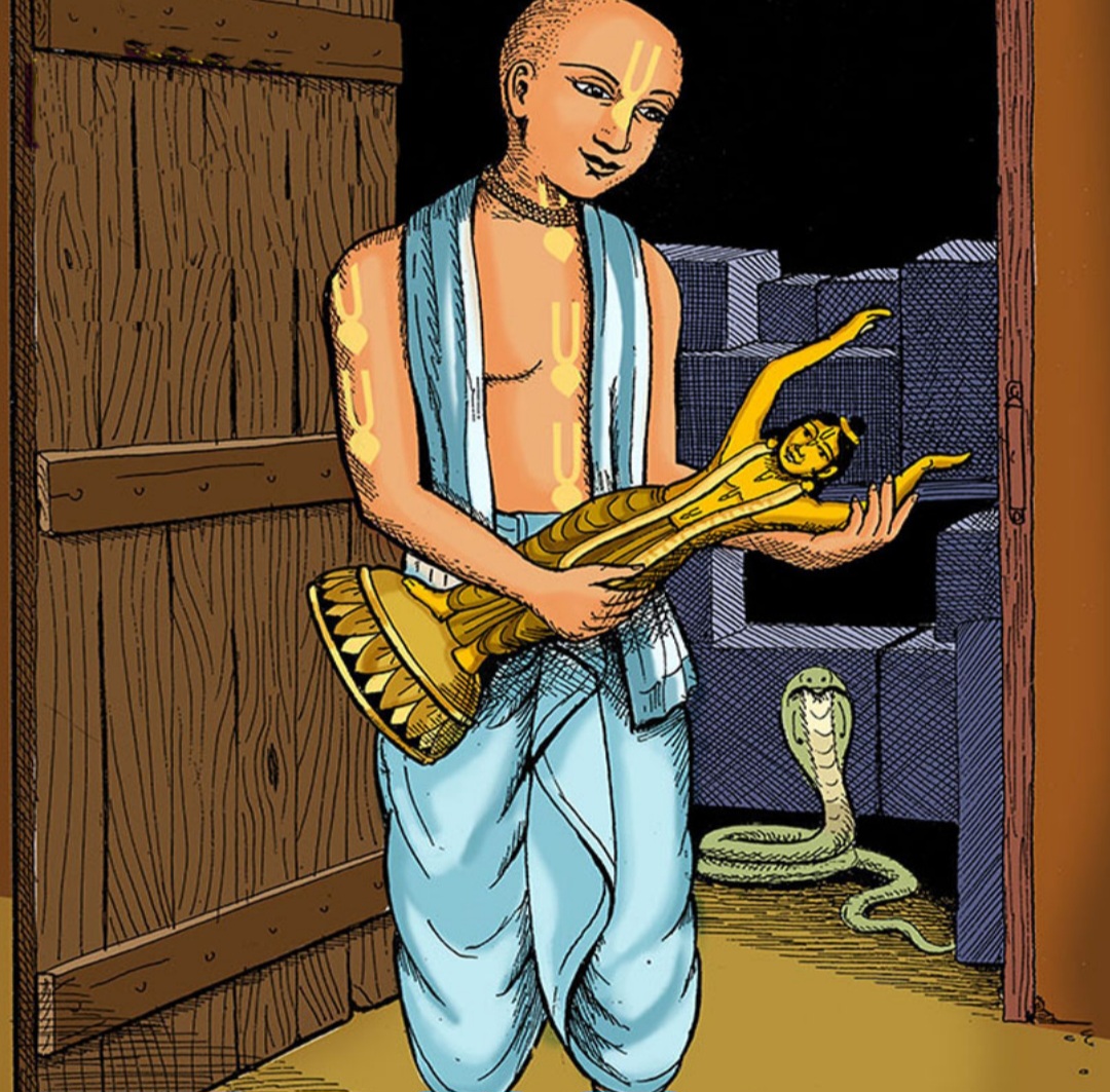 According to the Premavilāsa, when Mahaprabhu passed through Kānāir Nāțaśālā, as He was dancing ecstatically in kirtan, He began to call out the name Narottama. When Nityananda asked Him why He was calling out this name, Mahaprabhu answered, “My Lord, You do not know Your own glories. When we went to Jagannath Puri, You shed tears out of divine love, day after day. I managed to capture Your divine love and save it. Now I wish to keep it here by the Padmavati River for Narottama Das.”Mahaprabhu then went on to the Padmavati River to the place known as Kutubpur, where He bathed and sang and danced in ecstasy. He then called out to the river, “O Padmavati! Take My love and keep it here. When Narottama comes and bathes here, give it to him.”Then Padmavati inquired, “How will I recognize him?”Mahaprabhu answered, “You will know it is Narottama, for when he enters your waters, you will overflow.”The place where Mahaprabhu placed prema for Narottam Das was later given the name Prematali. When Narottama was twelve years old, he had a dream in which Nityananda Prabhu told him to bathe in the Padmavati and take the prema which had been stored there for him. He went the next day to the Padma and as soon as he put his foot in the water, the river started to overflow. The Padmavati then remembered Mahaprabhu’s words and gave Narottama the prema which she had been safeguarding for him.
