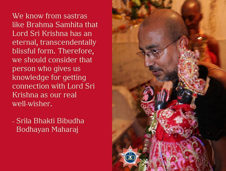We know from sastras like Brahma Samhita that Lord Sri Krishna has an eternal, transcendentally blissful form. Therefore, we should consider that person who gives us knowledge for getting connection with Lord Sri Krishna as our real well-wisher.