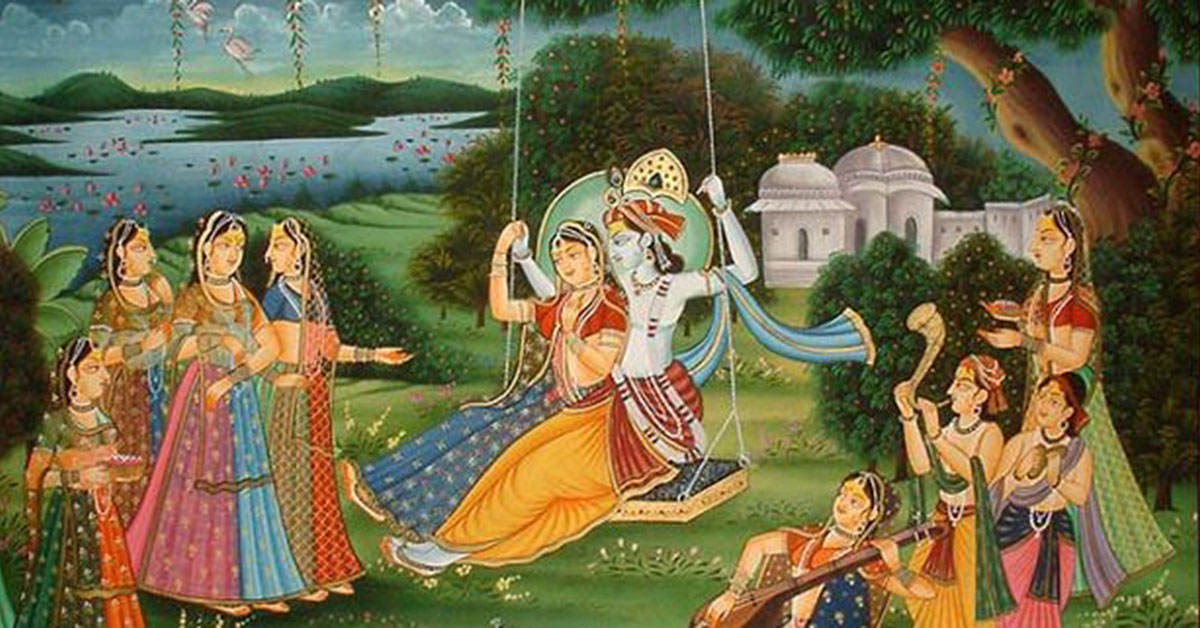 The jhulan yatra (swing pastime) of Sri Radha Govinda takes place in Vrindavan during the rainy season of Sravana month (July – August). As Lord Krsna enjoyed the pastimes with the gopis, He gradually approached the swing made of lotus flowers. Vrnda Devi and Kundalata placed the swing under Lord Hari, who sat on it. Smilingly, He coaxed the reluctant Srimati Radharani to sit beside Him. As Acyuta sat on the swing with His beloved Radharani, the delighted gopis surrounded the swing, pushing and pulling it from front and back, and singing loudly.As the swing’s speed gradually increased with the sakhis’ pushes, restless-eyed Radhika trembled with fear and held on to Iler lover, embracing Ilim. When the sakhis firmly pushed the swing, Radha and Krishna’s ear-rings swung, hair became disheveled, sashes entwined and flower garlands became entangled with Their jingling bangles.